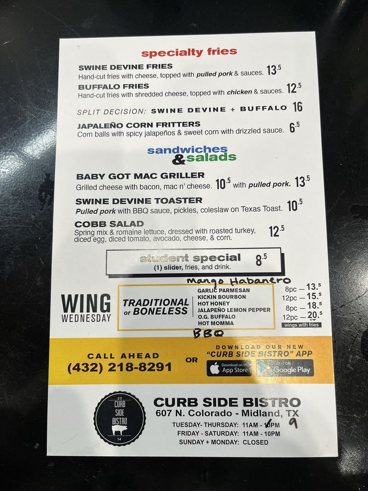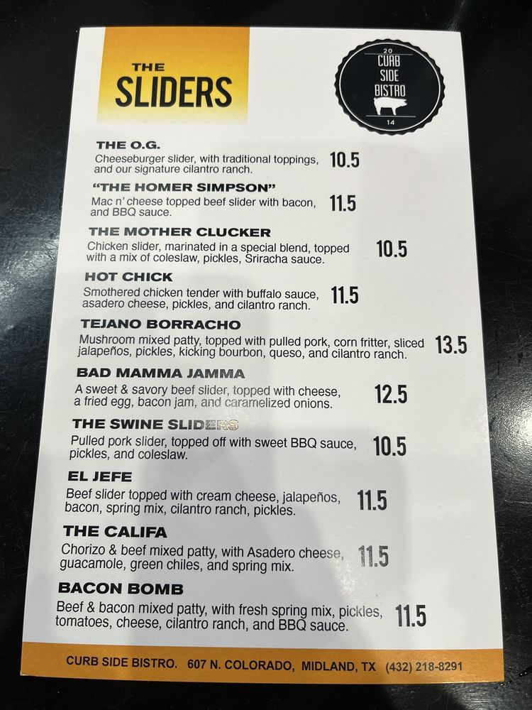 Introducing the delicious menu of Curb Side Bistro, where culinary artistry meets comfort food. Nestled at 607 N Colorado St in Midland, TX, this vibrant cocktail bar specializes in mouthwatering burgers, tantalizing chicken wings, and enticing sliders that have customers raving.